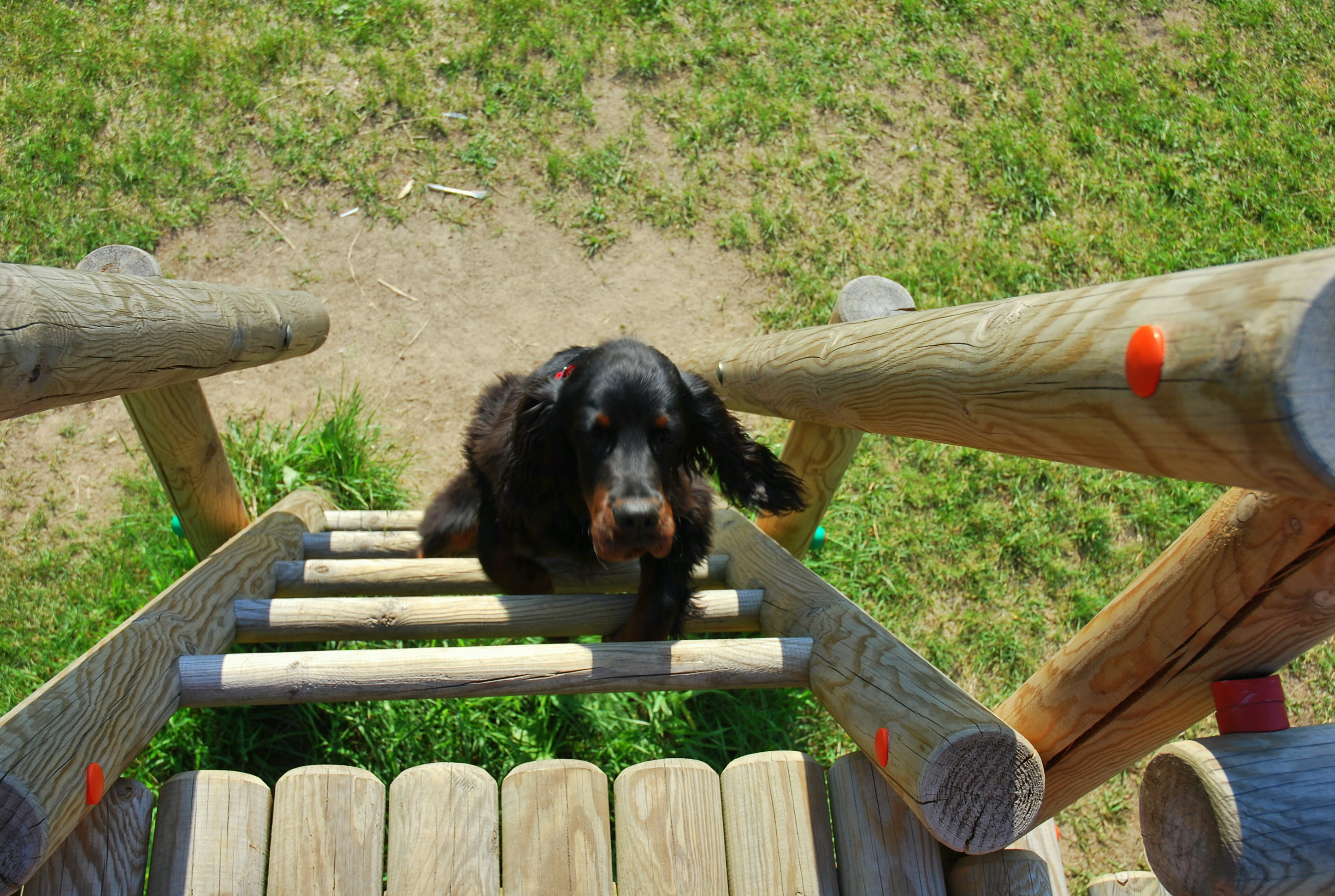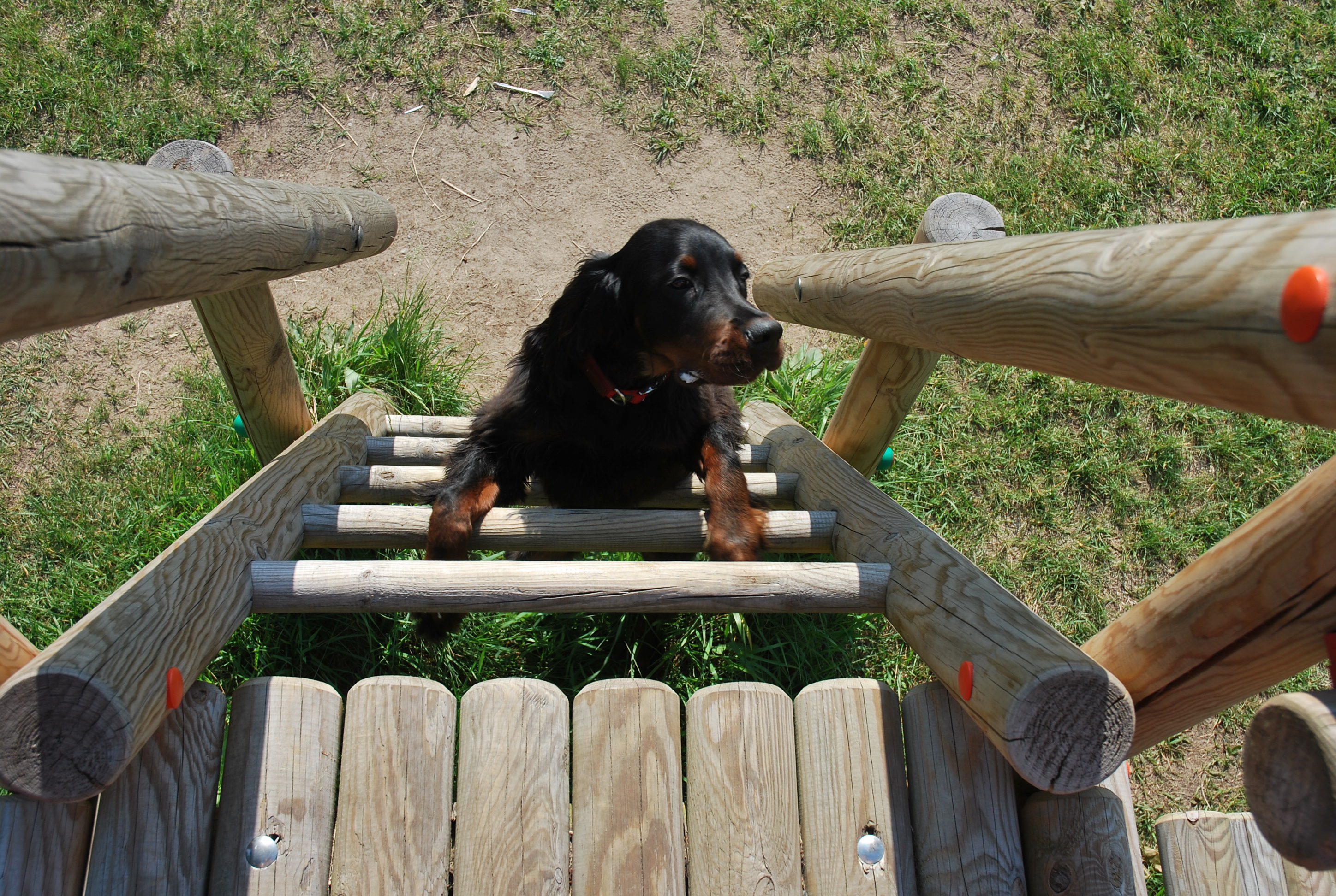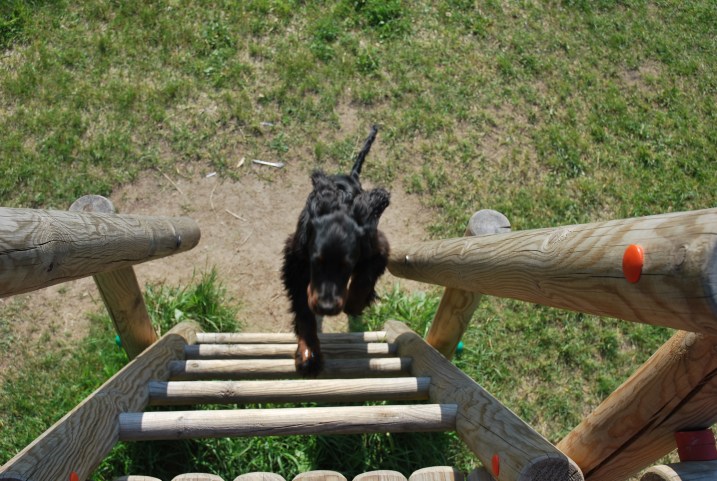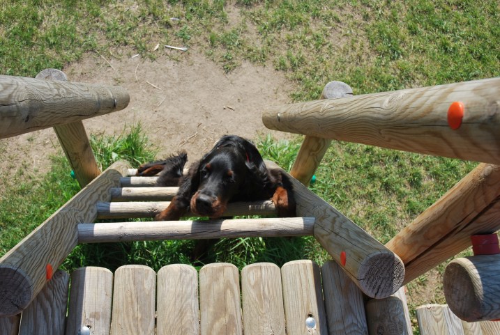 Dziś, podczas porannego spaceru, dotarliśmy na wielka polanę, gdzie wśród krzaków i komarów był plac zabaw. Wlazłam na drabinki myśląc, że porobię Ryjowi trochę fotek z innej perspektywy niż zwykle… Niestety mi się to nie udało, bo Berek natychmiast postanowił do mnie dołączyć… Był tak zdesperowany, by wleźć na górę, że musiałam do niego szybko zejść, bo gotów był zrobić sobie krzywdę … Co za kochana ciamajda 🙂
