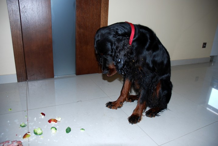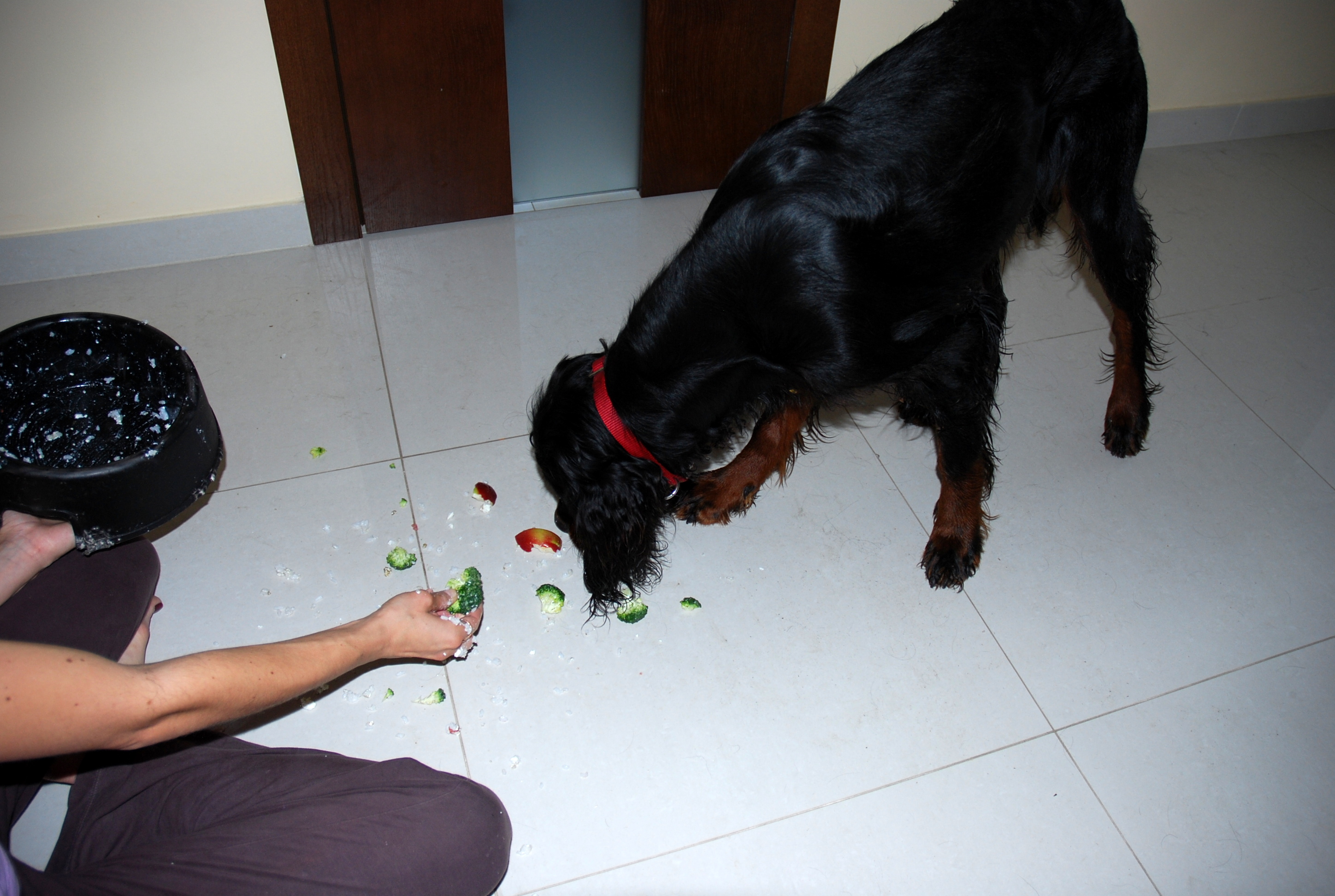Załączam fotki z karmienia. Berek robi syf wokół miski, no ale cóż… Cierpliwie czeka aż brokuła i kalafiorek zamienią sie w kawałki mięska… Widzicie jedzenie poprzyklejane do psich uszu? 🙂