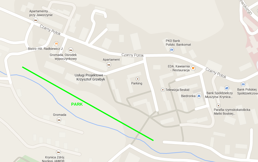 Park w Czarnym PotokuDo parku można dostać się od strony zajezdni autobusowej przy wjeździe do ośrodka Gromada, lub przebić się przez osiedle od strony ulicy Czarny Potok. W parku, przy alejce jest tabliczka zabraniająca wyprowadzania psów. Jak dla mnie nie jest to jasne czy chodzi o ogrodzone boiska, czy generalnie cały park. Tak czy inaczej, podczas spacerów spotykaliśmy wielu miejscowych psiarzy.