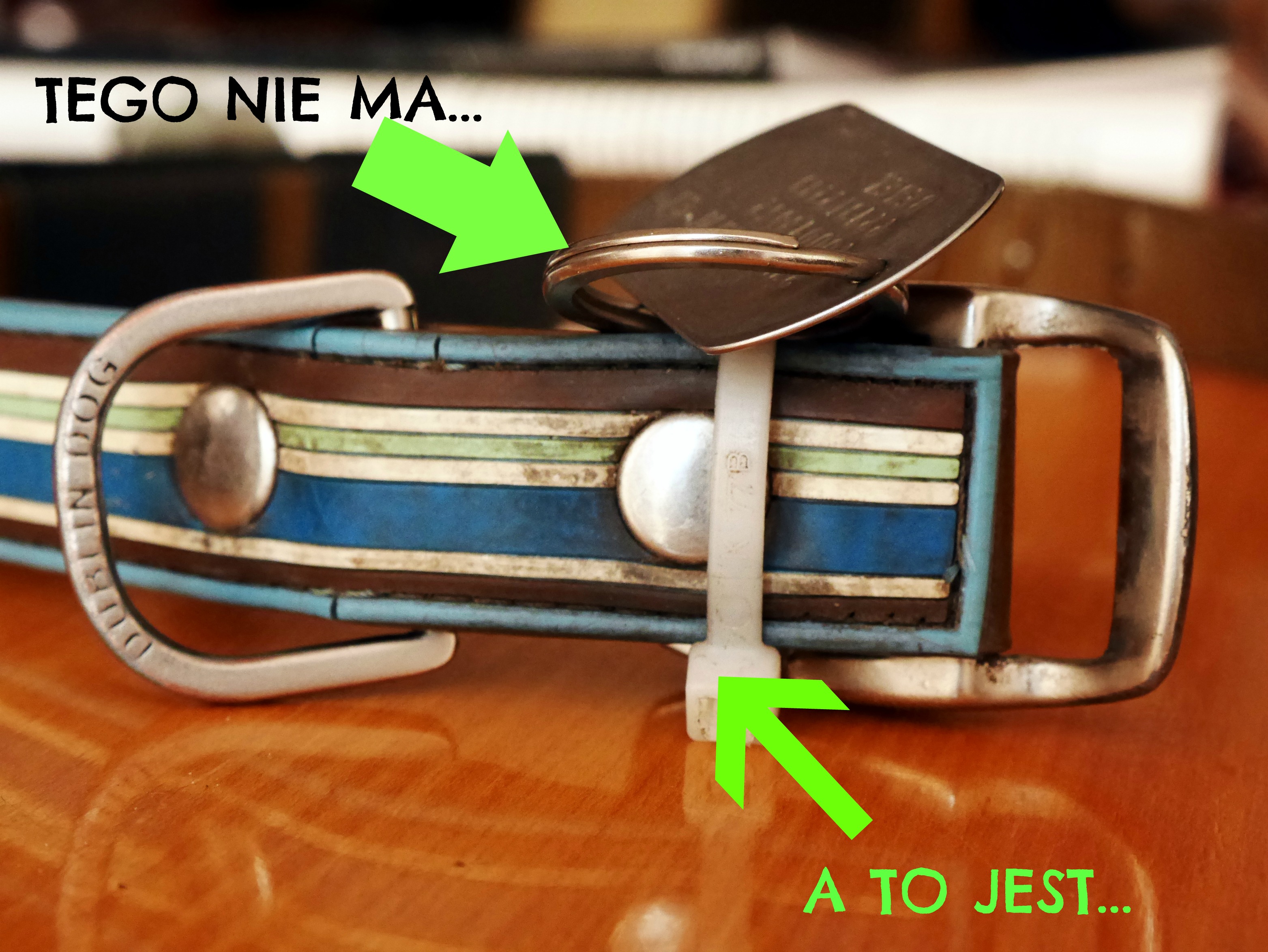 … podłamałam się :P. Myślałam, że potrafię oszukać pecha i stosując plastykową zapinkę zaciskową (na zdjęciu to białe), dodatkowo grube kółeczko od breloczka i brzydki, nieciekawy, ale mocny nieśmiertelnik jako psie ID, przymocuję mocno adresówkę. Zapinka sprawia, że ID nie jeździ po obroży, na czym mi też zależało. Myliłam się – Berek wrócił do domu z samą plastykową zapinką przymocowaną do obroży. Gdzie podziało się metalowe kółko i adresówka? Wisi gdzieś na krzaku, albo leży w trawie. W domu przymocowałam w taki sam sposób nowy nieśmiertelnik, ale zaraz zaczęłam szukać w internecie innych rodzajów adresówek. Wyszłam z założenia, że jeśli moja innowacyjna konstrukcja zaczepowa nie dała rady raz to zapewne podda się ponownie.