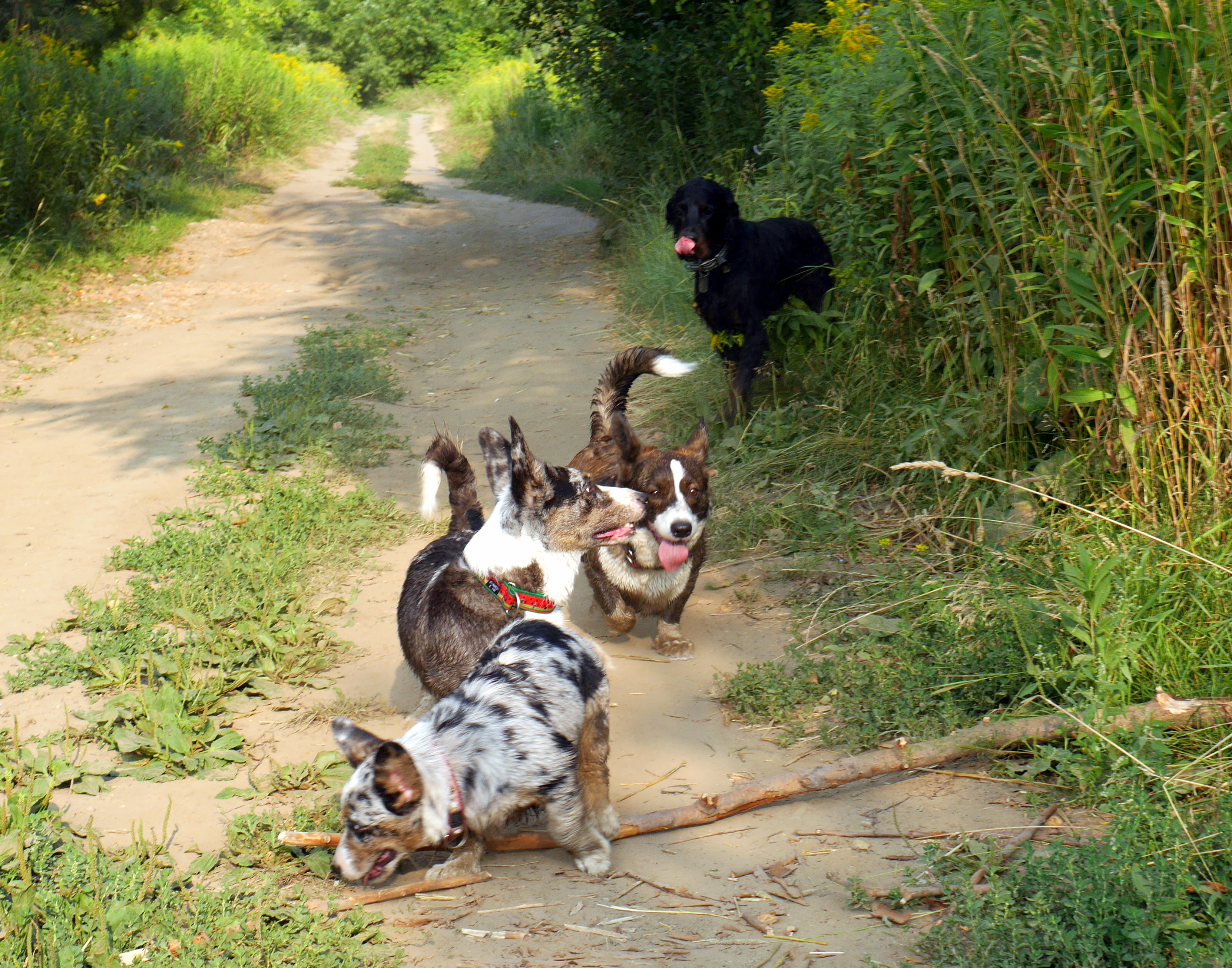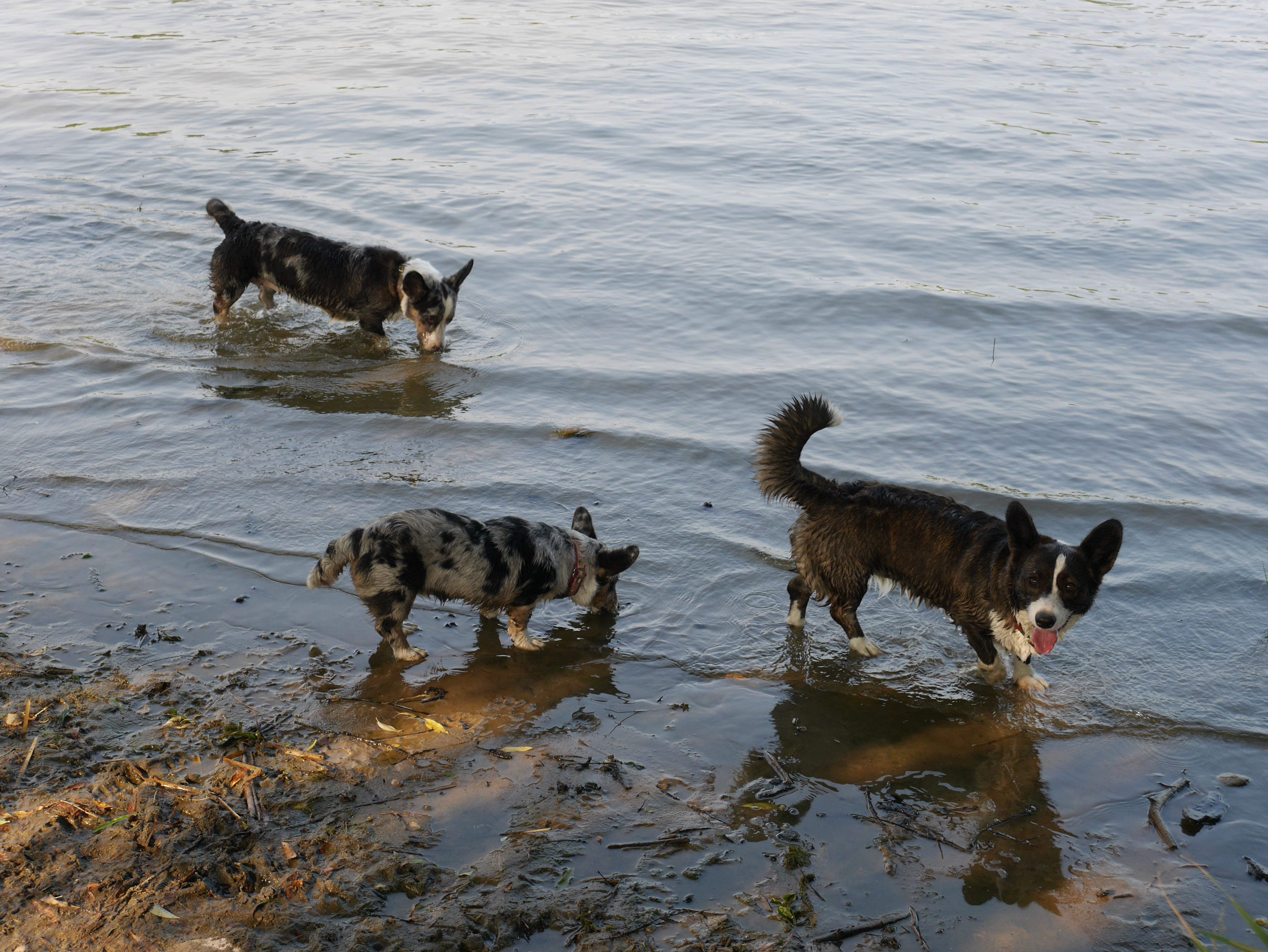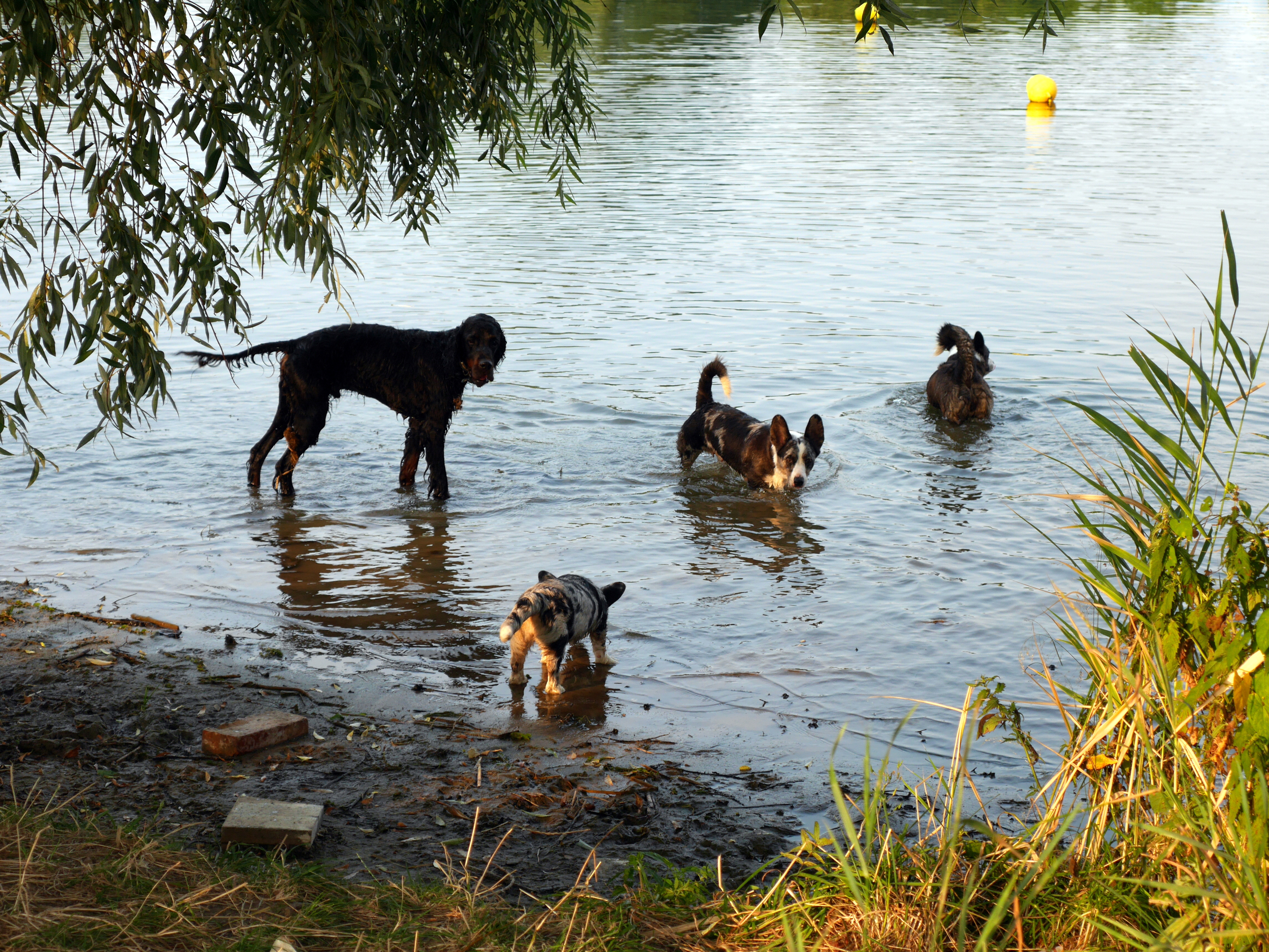 Wczoraj rano wybraliśmy się na spacer z Cardimanią. Trzem przepięknym Corgi udało się naprawdę zmęczyć mojego psa – rewelacja! Bawiły się dokładnie tak jak lubi Berek – czyli w ganianego. Berek był zachwycony, a i maluchom chyba też się podobało ;). W międzyczasie psy pogoniły zająca (nagle podczas psiej zabawy zobaczyłyśmy ze po polu latają nie cztery zwierzaki, a pięć…), ale szybciutko wróciły, nawet Berek, i całkiem przyzwoicie potem kontaktował z bazą chociaż jeszcze musiał powciągać wszystkie zapachy pozostawione przez zająca i trochę się polatać w amoku, ale już wokół nas. Psiaki moczyły się w jeziorze, pływały, buszowały po krzakach w poszukiwaniu resztek z weekendowych pikników i innych śmieci. Ogólnie dogadywały się rewelacyjnie. Byłam naprawdę bardzo dumna z Berka, bo zachowywał się w sposób cywilizowany względem nowych znajomych i był wyluzowany.