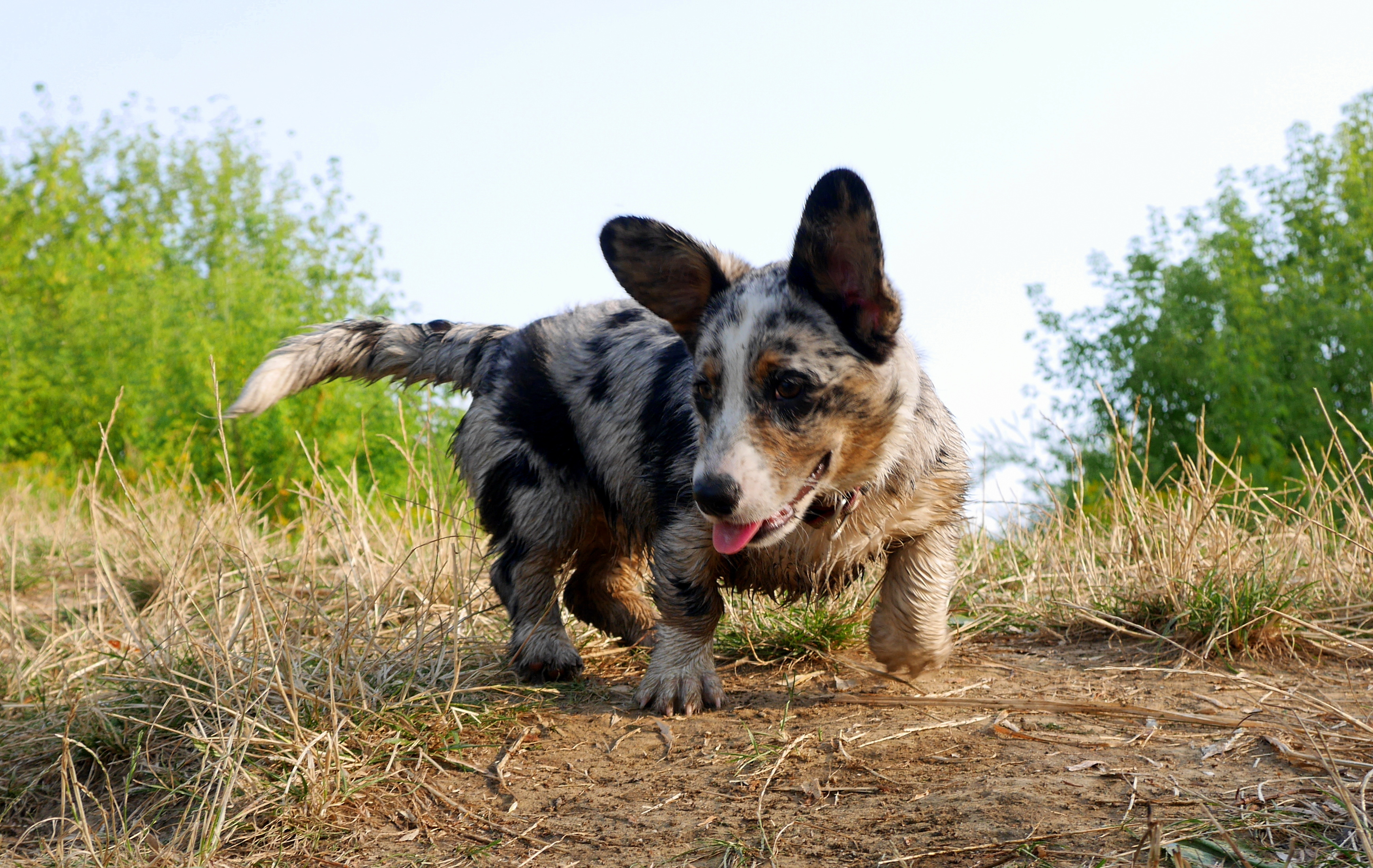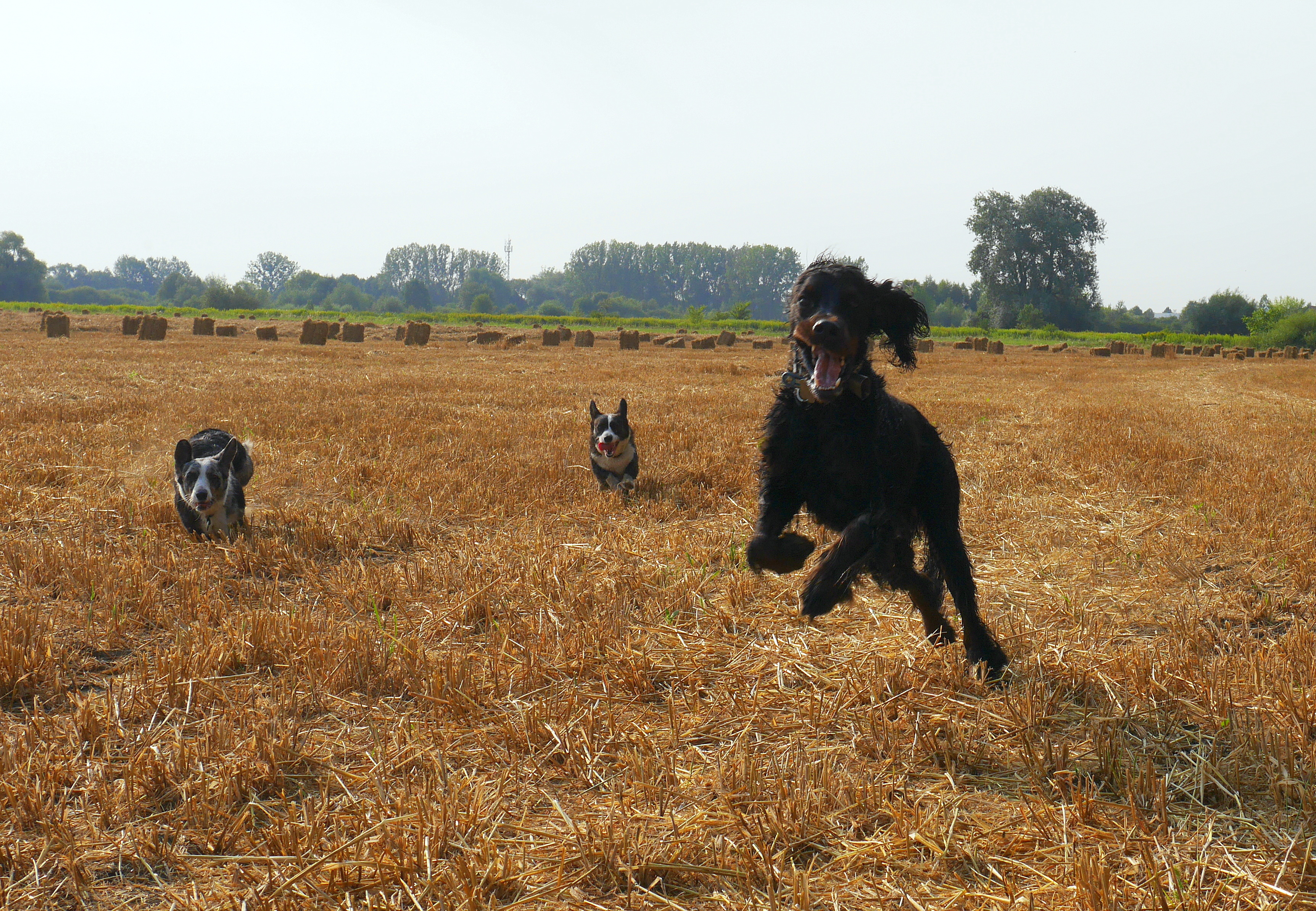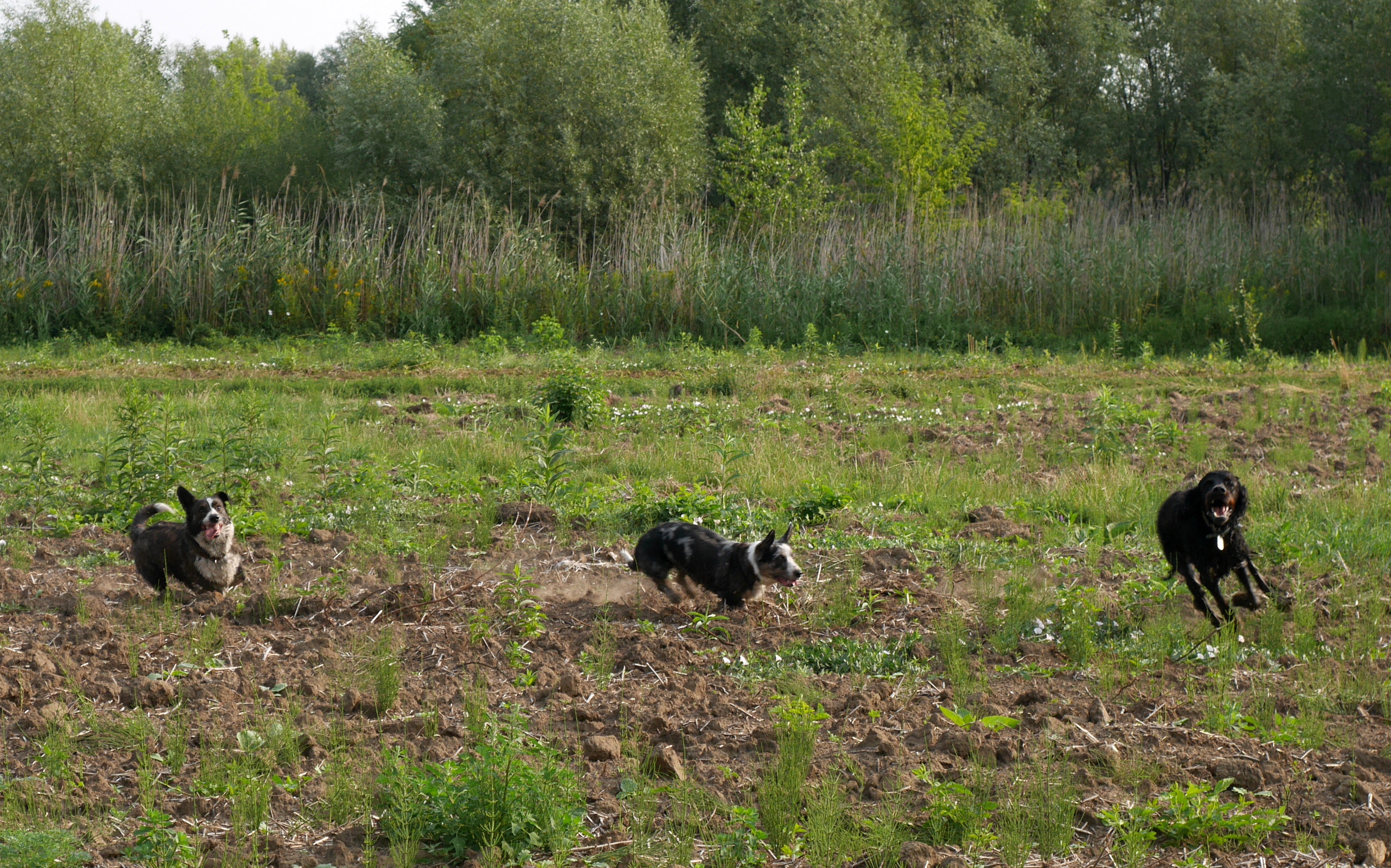 Wczoraj rano wybraliśmy się na spacer z Cardimanią. Trzem przepięknym Corgi udało się naprawdę zmęczyć mojego psa – rewelacja! Bawiły się dokładnie tak jak lubi Berek – czyli w ganianego. Berek był zachwycony, a i maluchom chyba też się podobało ;). W międzyczasie psy pogoniły zająca (nagle podczas psiej zabawy zobaczyłyśmy ze po polu latają nie cztery zwierzaki, a pięć…), ale szybciutko wróciły, nawet Berek, i całkiem przyzwoicie potem kontaktował z bazą chociaż jeszcze musiał powciągać wszystkie zapachy pozostawione przez zająca i trochę się polatać w amoku, ale już wokół nas. Psiaki moczyły się w jeziorze, pływały, buszowały po krzakach w poszukiwaniu resztek z weekendowych pikników i innych śmieci. Ogólnie dogadywały się rewelacyjnie. Byłam naprawdę bardzo dumna z Berka, bo zachowywał się w sposób cywilizowany względem nowych znajomych i był wyluzowany.