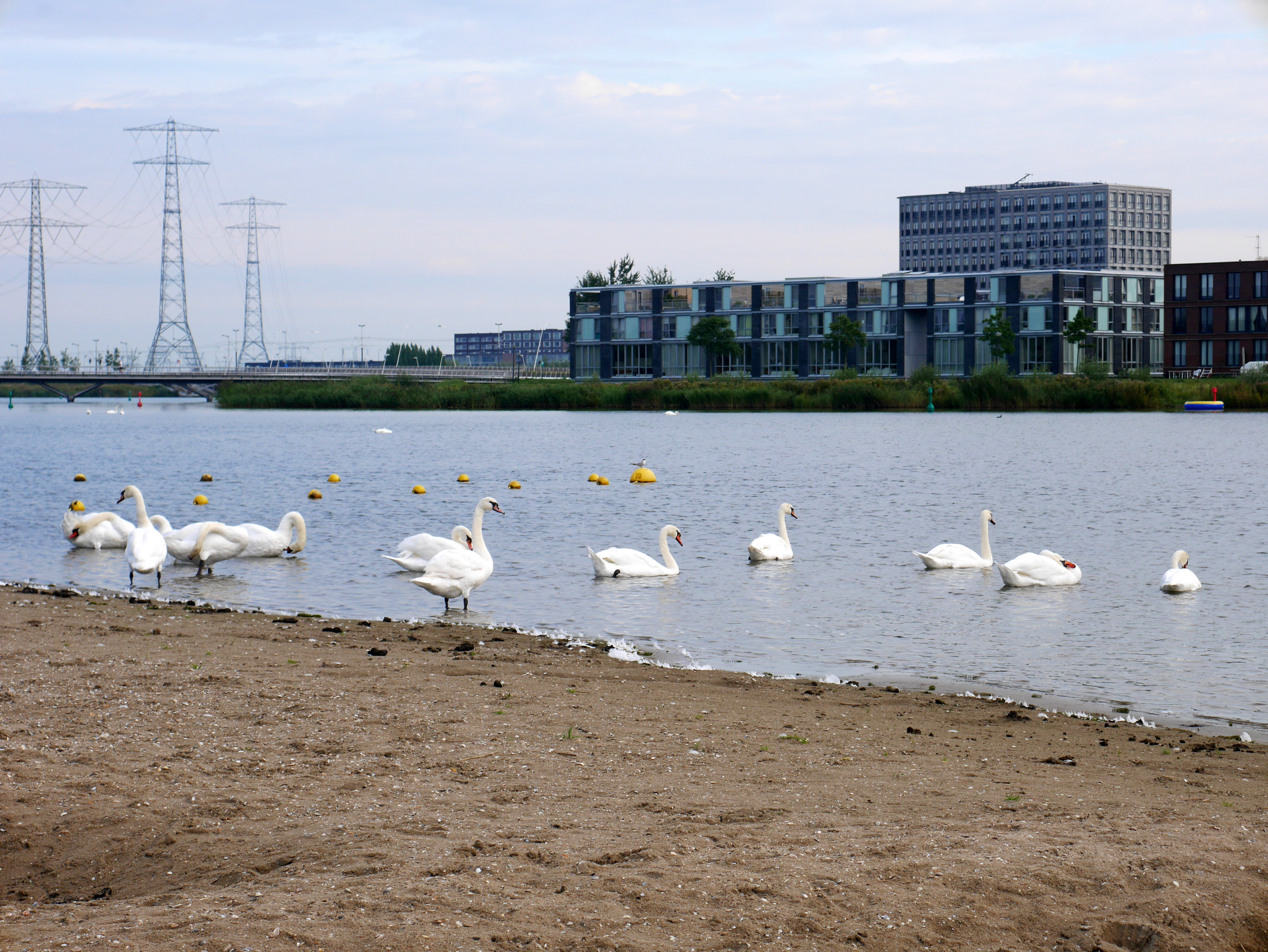 Diemerpark znajduje się na osobnej wyspie na którą można przespacerować się z części mieszkalnej. W parku znajduje się mała plaża, parę ścieżek rowerowych, plac zabaw i siłownia na powietrzu. Nie znając miasta stwierdziłam, że Berek biegając po wyspie będzie bezpieczny, bo przecież nie rzuci się w wodę. Dotarłam na IJburg pełna nadziei. Szybko poleciałam mostkiem do Diemerparku, ale zaraz przy wejściu zobaczyłam to:
