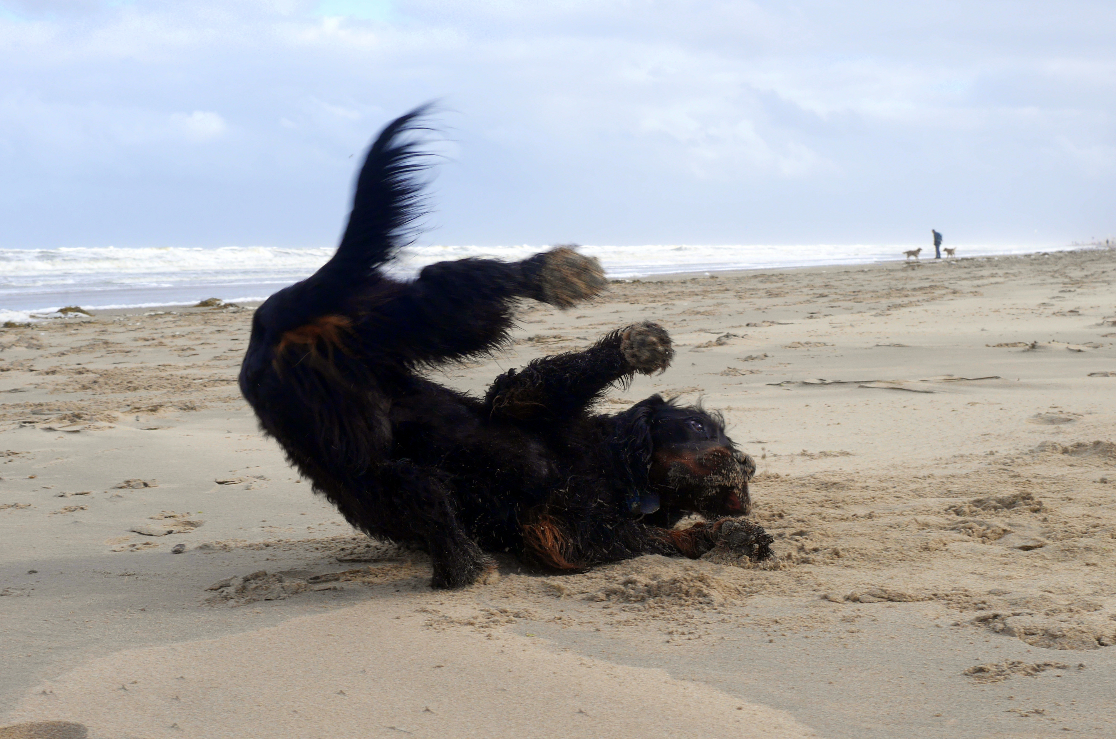 Noordwijk dog beach Noordwijk dog beach P1110562 seter gordon seter gordon Seter gordonseter gordon seter gordonA co robi Psi Ryj na plaży? Cóż może robić? Szuka zapachów, tak więc spacer jest zdecydowanie ciekawszy gdy wieje mu w ryj, niż gdy idziemy z wiatrem. Glony i piana z fal też wydały mu się całkiem interesujące, ale niestety słone, a branie ich do pyska nie było już takie zabawne. Berek próbuje (ciągle i się nie podaje) upolować mewy. Wręcz urocze jest jak skrada się do każdej po kolei licząc, że tym razem się uda. Psi Ryj nie należy do jakoś wybitnie towarzyskich psów – raczej zajmuje się sobą i swoimi sprawami. Dlatego też podchodził do psów nieśmiało, lub tylko dawał się obwąchać i szedł dalej. Parę razy troszeczkę się pobawił, ale to były krótkie momenty. Może za dużo się dla niego działo, może to już nie ten wiek, nie ten charakter, albo nie był w nastroju. Spotkaliśmy nawet dwa setery angielskie, ale Berek się ich bał, bo tworzyły grupkę i go onieśmielały.