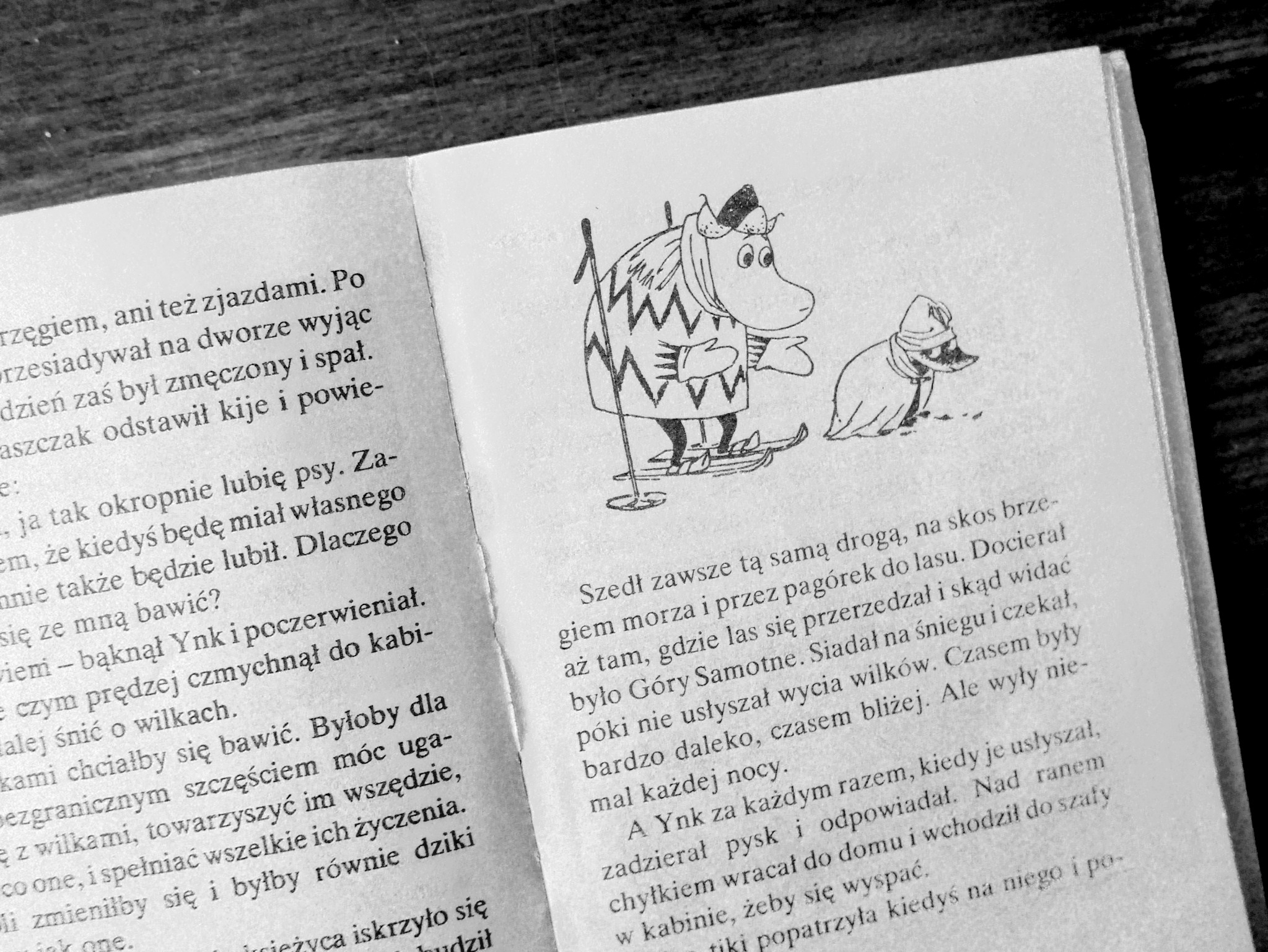 Zacznijmy od Muminków. Dolinę Muminków odwiedza wiele dziwnych stworów. Być może niektóre mają coś z psa czy wilka, albo dzikiego kota, ale tylko jeden był prawdziwym psem. Pojawia się z książce pt Zima Muminków i ma na imię Ynk (w wersji angielskiej Sorry-oo). Ynk marzy o tym by dołączyć do watahy wilków. Każdej nocy mały piesek, ubrany w płaszczyk i czapeczkę, idzie do lasu i czeka na wilki. Ma nadzieję, że go zaakceptują i będzie mógł stać się taki jak one. Rano wraca do domu Muminków i, wyczerpany nocnymi wędrówkami, przesypia cały dzień. Niestety wilki nie są zainteresowane towarzystwem Ynka, a wręcz są do niego wrogo nastawione. Pewnej nocy, gdy wilki chcą zaatakować Ynka, pojawia się nagle Paszczak i przypadkowo odpędza watahę. Ynk stwierdza, że nie będzie już marnować życia na coś czego być może nigdy nie będzie mu dane zaznać i postanawia zostać przyjacielem Paszczaka. Odchodzą razem na poszukiwania nowych przygód.