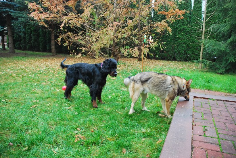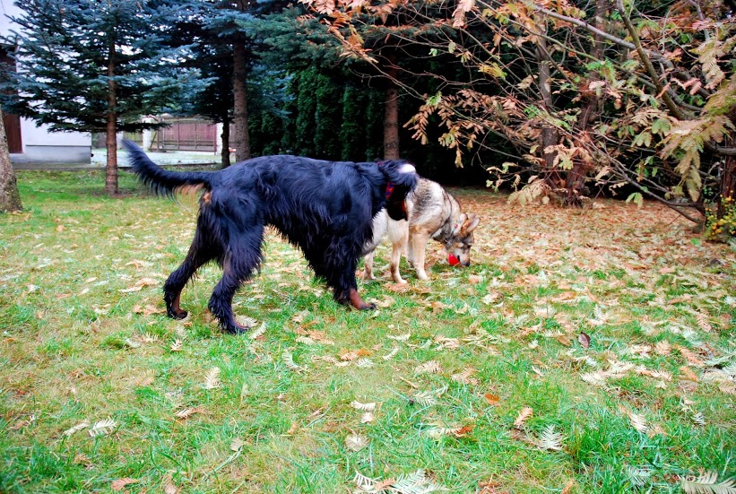 W nocy zaglądaliśmy do Robercika regularnie, żeby zobaczyć co tam robi. Gdy zobaczył mnie postanowił pozwiedzać dom. Tak więc o 3.00 w nocy zamiast spać łaziłam po chałupie i pokazywałam psu różne kąty :). W niedzielę rano zabrałam Berka na długi spacer po polach, a Robercik mógł swobodnie pochodzić po ogrodzie i popilnować moją mamę, która szykowała mu jedzenie. Robercik, z powodu swojej choroby, jest właściwie zupełnie bezbronny w kontaktach z innymi psami. Nie ma nawet możliwości uciec, uskoczyć, czy położyć na plecach i pokazać brzuch. Berek go onieśmielał, mimo iz tylko zapraszał go do zabawy. Jednak energia jaką ma mój pies, szybkość i zamaszystość ruchów po prostu przeraża unieruchomionego Robercika. Ich wzajemne kontakty muszą na razie być kontrolowane, bo Robercik nie czuje się jeszcze pewnie i obawia się Berka. Jednak i tak uważam, że mój pies jest cudowny, bo mimo iż Robercik nagle zjawił się na, bądź co bądź, jego terenie, nic mu nie zrobił, tylko machał do niego ogonem. Uważam, że oba psy doskonale wiedzą jaka którego jest pozycja i stanowisko w tej znajomości i Berek doskonale zna swoja przewagę fizyczną. Jednak niesamowite jest, że samiec nie czuje potrzeby tego wykorzystać i jedyne czego chce to wąchać i bawić się z kolegą. Berek jest super :).