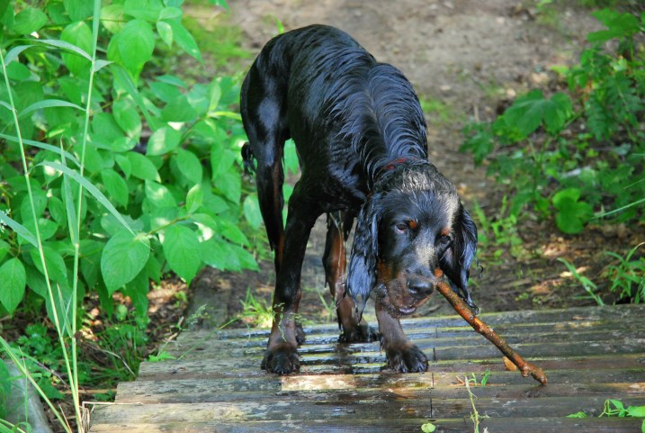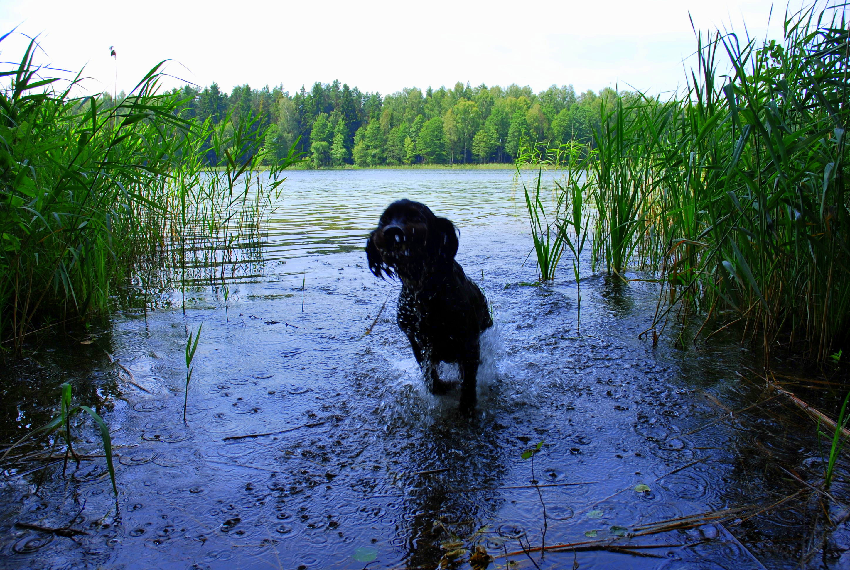 A Berek? Berek zakochał się w wodzie :). Myślę, że psiak jest już dostatecznie duży i pewny siebie by naprawdę cieszyć się z pluskania w jeziorze. Wyraźnie ciągnęło go do wody. Czasem miałam wrażenie, że z tej wody wystaje uśmiechnięta w Disney’owski sposób psia morda :). Berek dzielnie wbiegał do wody i dopływał do wrzucanych przez nas patyków. Wybiegał z jeziora galopem, wpadał na nas i prosił by wrzucać mu znów patyk do wody. Bał się jednak wskakiwać z pomostu, choć wydaje mi się, że gdybyśmy spędzili nad wodą jeszcze z jeden dzień to by fruwał z pomostu do wody z rozbiegu 🙂