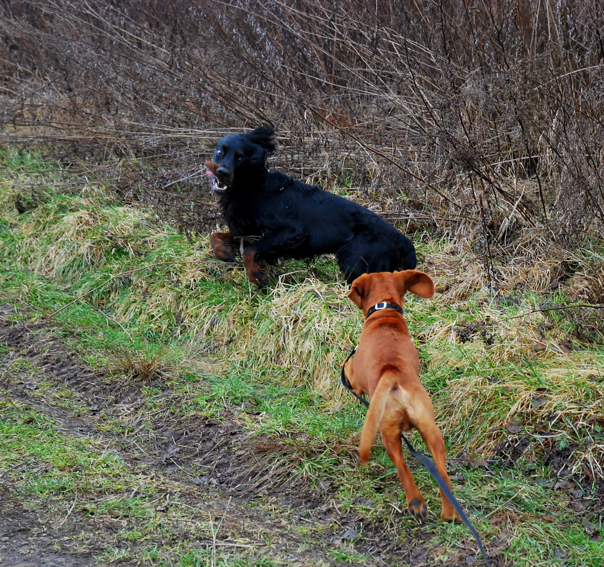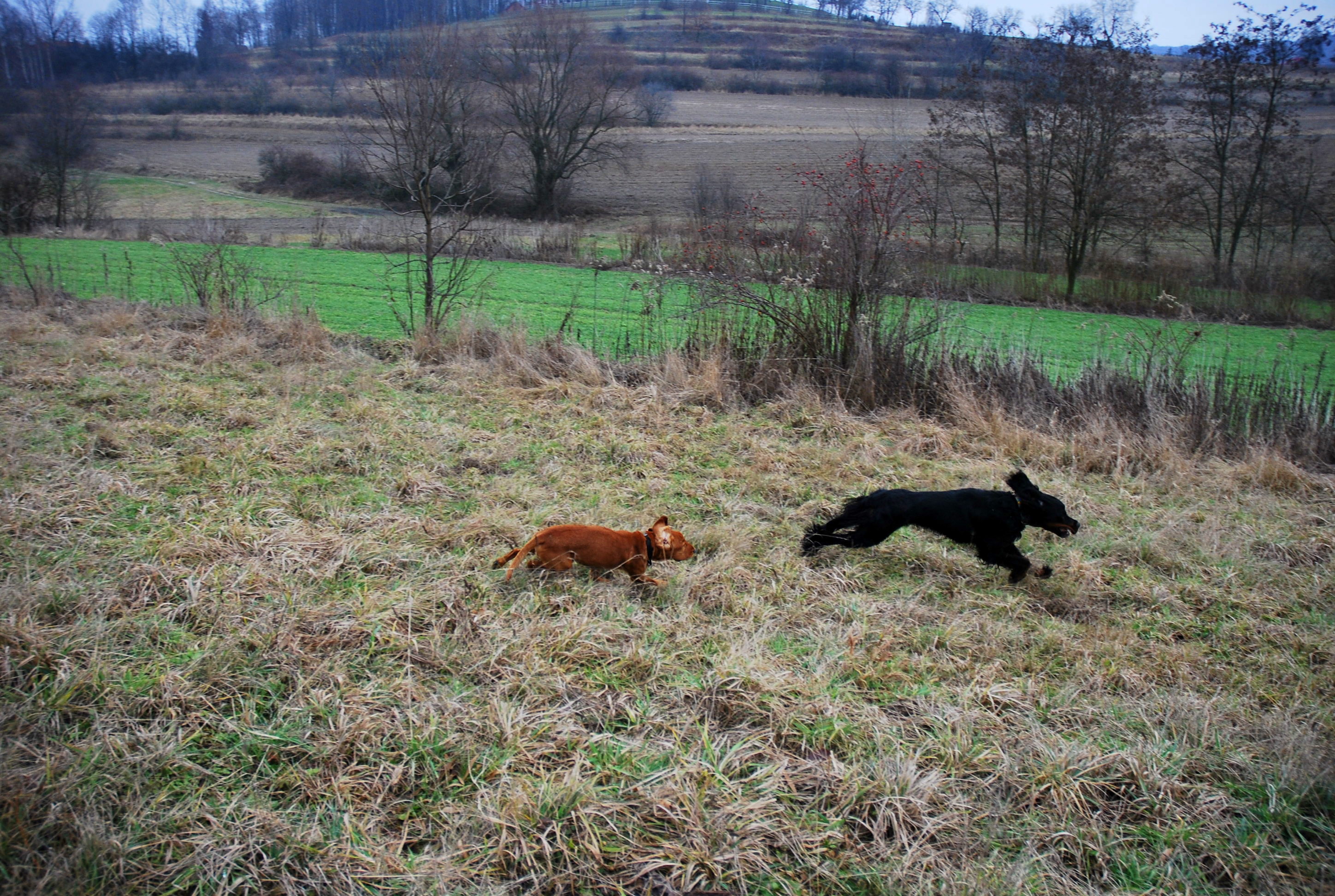 Amber jest moim ulubionym nie moim psem :). Zdobył moje serce już dawno, a chłopak wie ile mocy ma jego słodkie spojrzenie :). Poszliśmy z psiakami na pola, gdzie mogły swobodnie biegać. Przyznaję, że nie do końca rozumiem relacje panujące pomiędzy Berkiem a Amberem. Wydaje się, że tolerują się, ale każdy z nich na swój własny sposób próbuje ustawić tego drugiego. Berek ignorował zaczepki Ambera, ale do czasu, gdy nie pojawiły się smaczki. Wtedy położył go na łopatki i pokazał, że nie ma dyskusji – kiełbaska jest jego. Jednak już po chwili Amber próbował pokazać, że on też ma coś do powiedzenia i tak łatwo nie ulegnie.