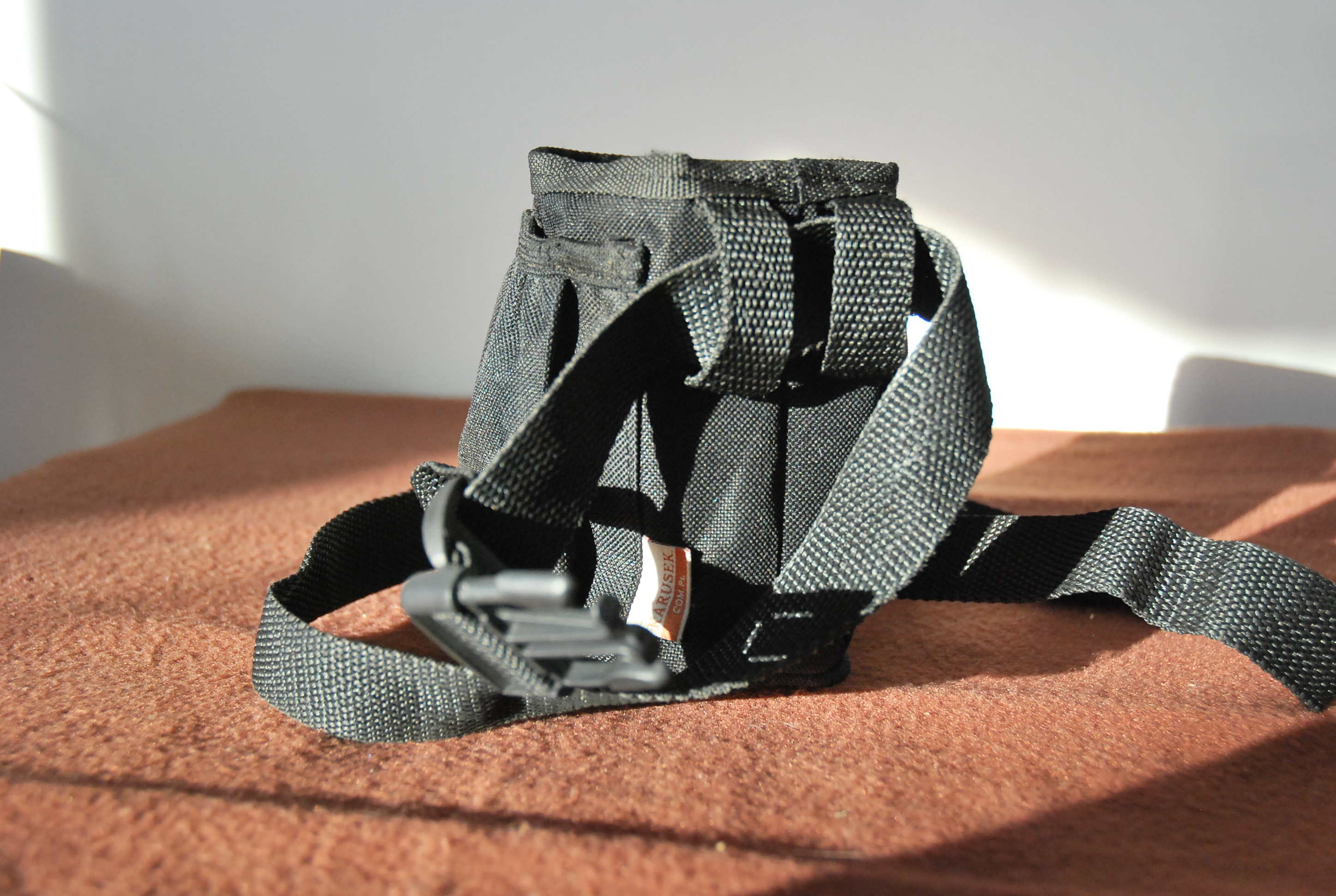 Saszetka, którą kupiłam w sklepie Karusek w Krakowie, także świetnie się spisuje. Jest również sztywna i odpowiednio duża, aby pomieścić tyle smaczków ile jest mi potrzebnych na długi spacer. Z boku ma dwie małe kieszonki – jedna jest na woreczki na psie odchody, a druga może być na kliker. Saszetka jest zamykana na zaciągany sznurek. Minusem jest materiał, który ma się ściągać, gdyż przeszkadza w sięganiu po smaczki. Nie da się go niestety wywinąć na zewnątrz sakiewki. Sznurek wpada więc do środka i plącze się między palcami, gdy sięgamy po smakołyki. Saszetka nie ma też wyjmowanego wkładu przez co w celu utrzymania czystości trzeba ją prać całą. Podobnie do saszetki z Doog’a, Karuskowa torebka ma stosunkowo mocne mocowanie, pasek i zatrzaski.